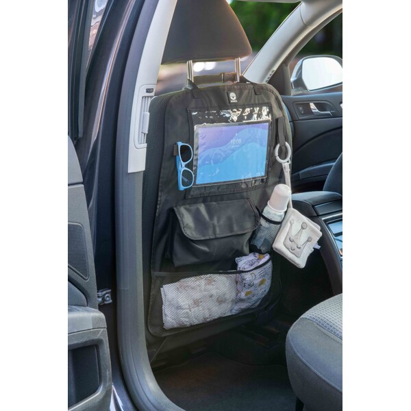 Viele praktische Fächer und ein Tablet-Halter sind enthalten. Es gibt reichlich Platz, um Bücher, Spielzeug, Snacks für die Reise, Flaschen und Feuchttücher zu verstauen.