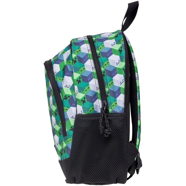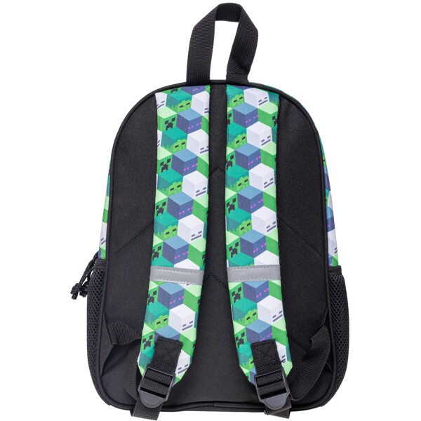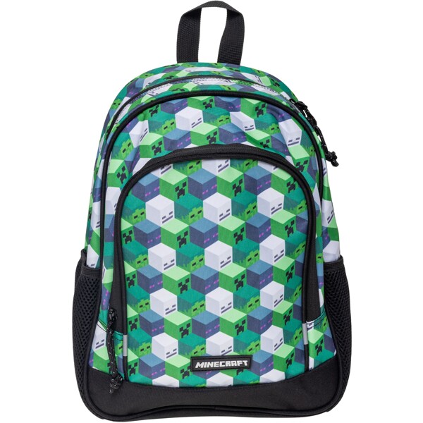 Ein Junior-Rucksack mit zwei Fronttaschen mit Reißverschluss, 2 Seitentaschen aus Mesh, Reflektoren an beiden Gurten, gepolsterten Gurten und einem Brustgurt. Der Rucksack hat einen Aufdruck von Minecraft in blauen und grünen Tönen.