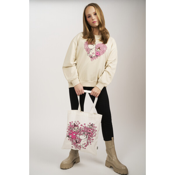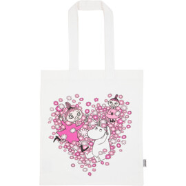 Schöne und praktische Stofftasche aus robustem Canvasgewebe, hergestellt aus recycelter Baumwolle und recyceltem Polyester. Die Vorderseite der Tasche ist mit einem Herz mit Mumin-Charakteren verziert. Die stabilen Griffe können in der Hand oder über der Schulter getragen werden. Perfekt für alle, die den Gebrauch von Plastiktüten reduzieren möchten.