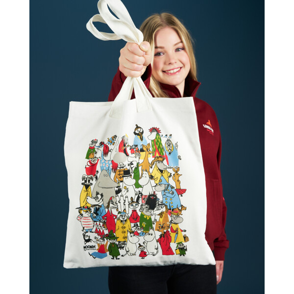 Eine praktische Mumin-Stofftasche aus robuster Baumwoll-Canvas mit einem farbenfrohen Aufdruck auf der Vorderseite. Kann in der Hand oder über der Schulter getragen werden. Hergestellt aus recycelter Baumwolle.