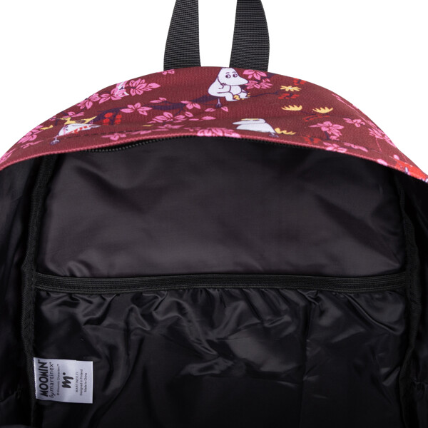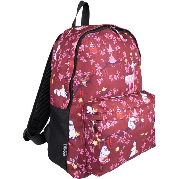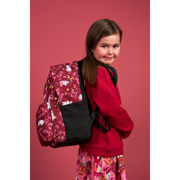 Ein Mumin-Rucksack aus robustem Polyester-Canvas. Der Rucksack hat doppelte Reißverschlüsse und eine Reißverschlusstasche vorne. Er verfügt über gepolsterte und verstellbare Schultergurte, eine offene Innentasche und einen kleinen Tragegriff oben. Volumen ca. 15 Liter.