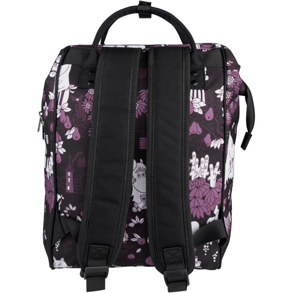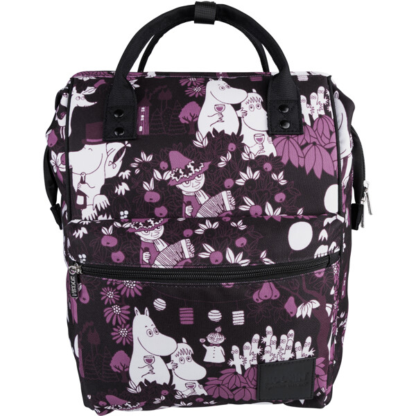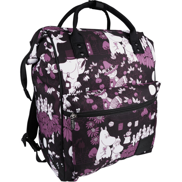 Ein geräumiger Mumin-Rucksack aus robustem Polyester-Canvas. Der Rucksack öffnet sich oben weit mit doppelten Reißverschlüssen und innen gibt es ein Laptop-Fach an der leicht gepolsterten Rückseite. Außentasche mit Reißverschluss vorne und verstellbare, gepolsterte Schultergurte. Volumen ca. 15 Liter.