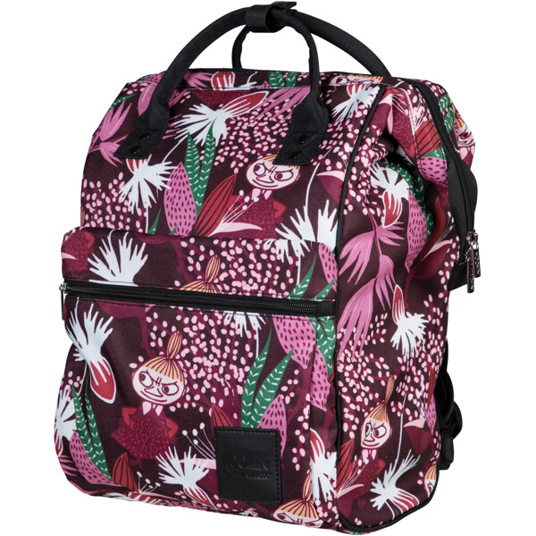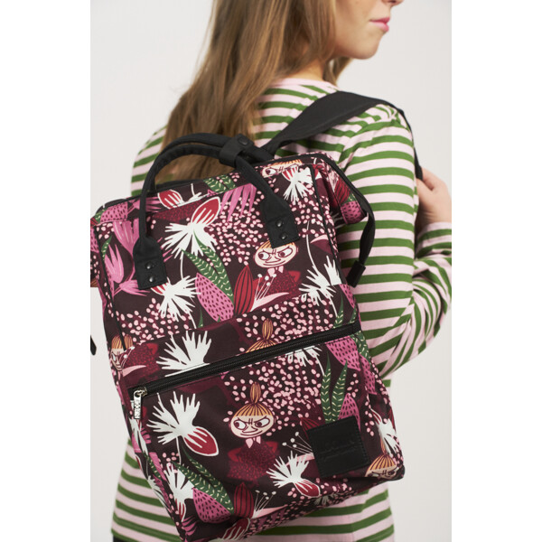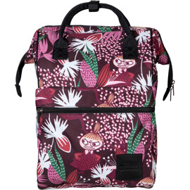Ein geräumiger Mumin-Rucksack aus robustem Polyester-Canvas. Der Rucksack öffnet sich oben weit mit doppelten Reißverschlüssen und innen gibt es ein Laptop-Fach an der leicht gepolsterten Rückseite. Außentasche mit Reißverschluss vorne und verstellbare, gepolsterte Schultergurte. Volumen ca. 15 Liter.