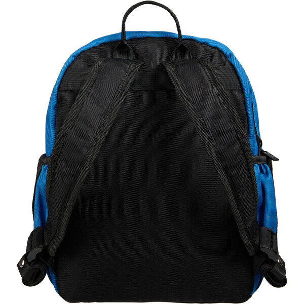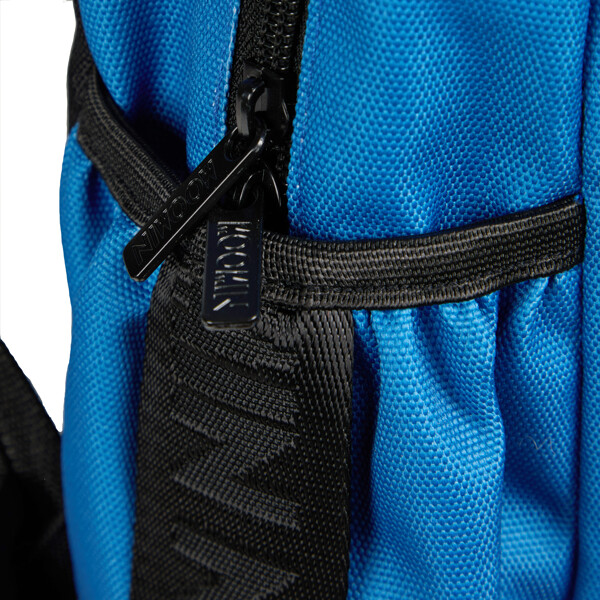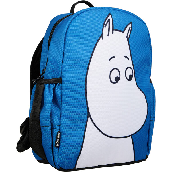 Ein praktischer Mumin-Rucksack aus robustem Polyester-Canvas. Ein Fach mit doppeltem Reißverschluss, eine kleine Innentasche mit Reißverschluss und offene Seitentaschen, perfekt für eine Wasserflasche. Der Rucksack hat verstellbare, gepolsterte Schultergurte und einen kleinen Tragegriff oben.
