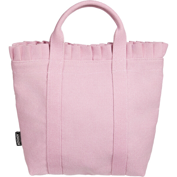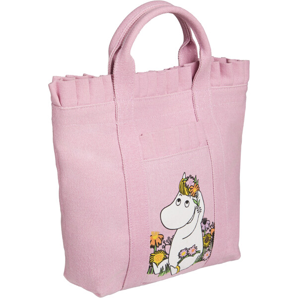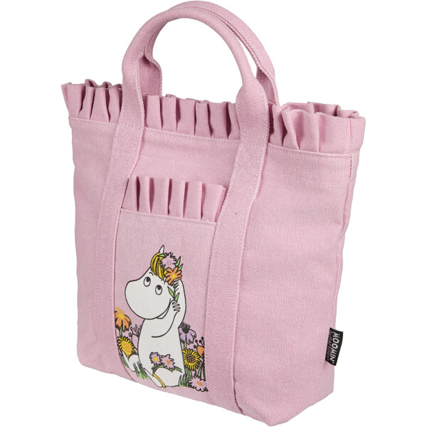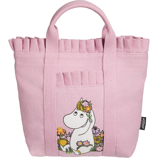 Eine süße kleine Tasche aus Baumwollstoff. Mit Druckknopf oben, einer kleinen Reißverschlusstasche innen und einer offenen Tasche vorne. Die Tasche ist mit Rüschen verziert und hat einen schönen Druck von Snorkfräulein. Die Metallteile sind silberfarben.