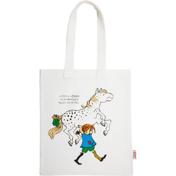 Eine praktische Pippi-Stofftasche aus robuster Baumwoll-Canvas mit einem lustigen Pippi-Druck auf der Vorderseite. Kann in der Hand oder über der Schulter getragen werden.