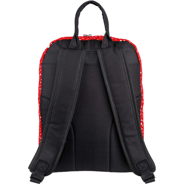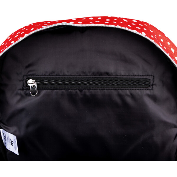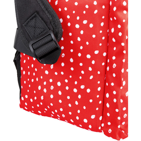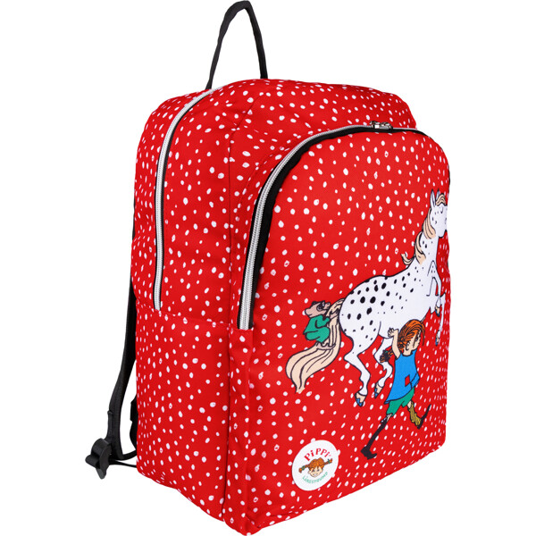 Ein praktischer Pippi-Rucksack aus robustem Polyester-Canvas. Der gewölbte Rucksack hat oben zwei Reißverschlüsse. Innen gibt es eine offene Tasche, z.B. für den Laptop. Der Rucksack hat verstellbare, gepolsterte Schultergurte und einen Tragegriff oben. Die Metallteile sind silberfarben. Das Volumen beträgt ca. 15 Liter.