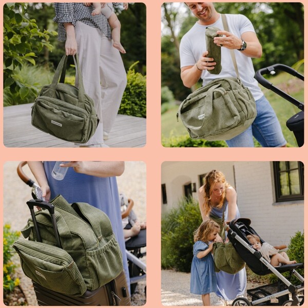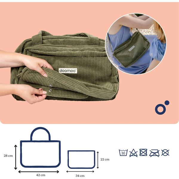 Die Doomoo Wickeltasche aus weichem Cord ist so gestaltet, dass sie alle Bedürfnisse frischgebackener Eltern vom ersten Tag an und während der gesamten Kleinkindzeit erfüllt.Die Tasche ist geräumig (24 l), was bedeutet, dass es reichlich Platz für Windeln, Kleidung, Flaschen und andere Babyprodukte gibt. Die vielen Taschen und Fächer sowie das mitgelieferte Zubehör machen die Wickeltasche komplett und erleichtern den Alltag, egal ob Sie zu Hause sind oder unterwegs.Die Tasche verfügt auch über eine abnehmbare Außentasche, die perfekt für Kleinigkeiten ist. Die abnehmbare Tasche funktioniert auch als zusätzliche Tasche für kurze Ausflüge!Was enthalten ist:Isolierte FlaschentascheSchnulleretuiWickelunterlagePraktische Kinderwagenbefestigungen (bleiben am Kinderwagen)Schultergurt (passt sowohl zur Tasche als auch zur abnehmbaren Tasche)Schlüsselring (in der abnehmbaren Tasche – damit Sie die Schlüssel sofort finden)Gurt zur Befestigung am KofferAbnehmbare Tasche, die separat oder zusammen mit der Tasche verwendet werden kannEigenschaften:Großes Volumen von 24 L & Abnehmbare Außentasche (4,5 L)8 verschiedene Zubehörteile enthaltenMaschinenwaschbarKann sowohl am Kinderwagen als auch am Koffer befestigt werden