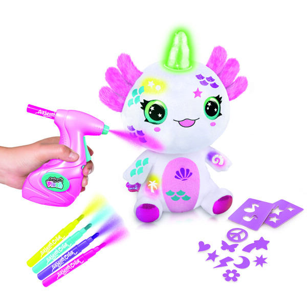 Enthält: - Axolotl-Einhorn-Plüsch mit leuchtenden Hörnern - Airbrush - 4 verschiedene Airbrush-Farben - 120 wiederverwendbare selbstklebende Schablonen - 1 Paar Handschuhe - 1 Anleitung - 1 Gebrauchsanweisung