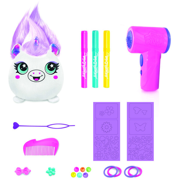 Enthält: - 1 Hair'iffic Squish Pal Plüsch 17 cm, Prinzessin - 1 2-in-1-Airbrush & Haartrockner - 4 Filzstifte - 2 Schablonen - Haarzubehör