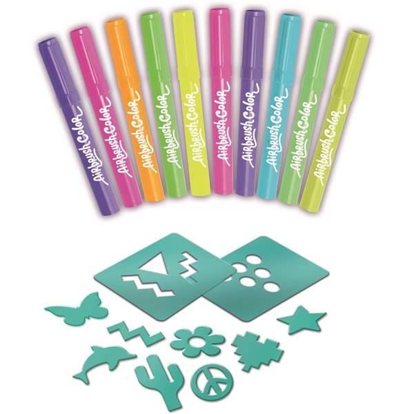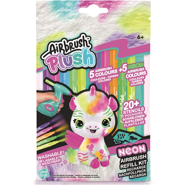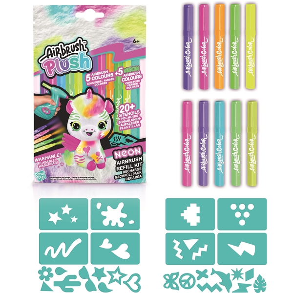 Ein spezielles Airbrush Plush Nachfüllset, das 10 Filzstifte enthält, davon 5 in Neonfarben, sowie 20 Schablonen, damit du noch mehr Erfahrung mit Airbrush Plush sammeln kannst. Du musst nur die Plüschfigur abwaschen, und schon ist sie bereit für ein neues Design.Enthält:- 10 Filzstifte (davon 5 in Neonfarben)- 20 Schablonen