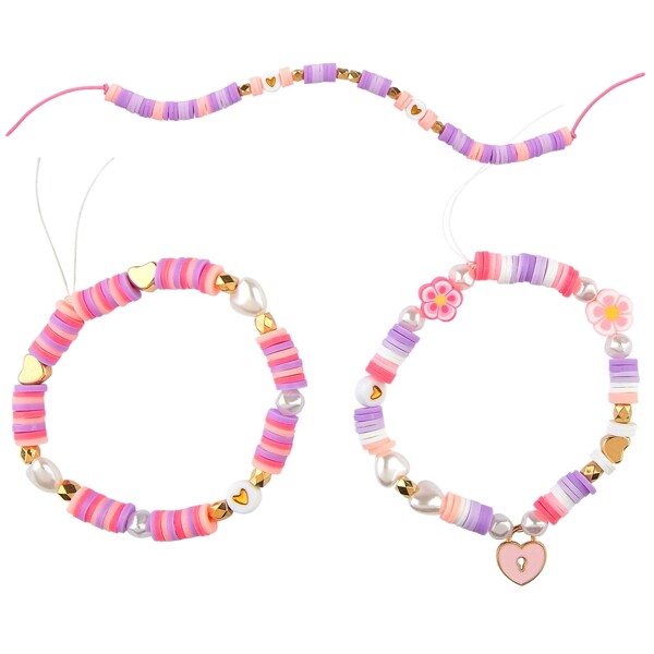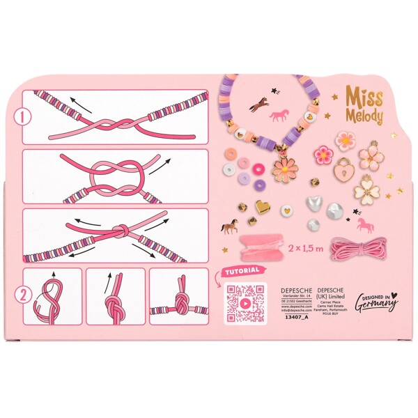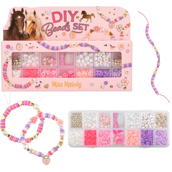 Dieses schöne Miss Melody-Perlenset enthält Perlen in 12 verschiedenen Farben und Formen, Anhänger mit Goldrand (Blumen & Herzen) sowie ein transparentes und ein rosa Gummiband (jeweils 1,5 m). Mit einfachen Anleitungen auf der Verpackung.