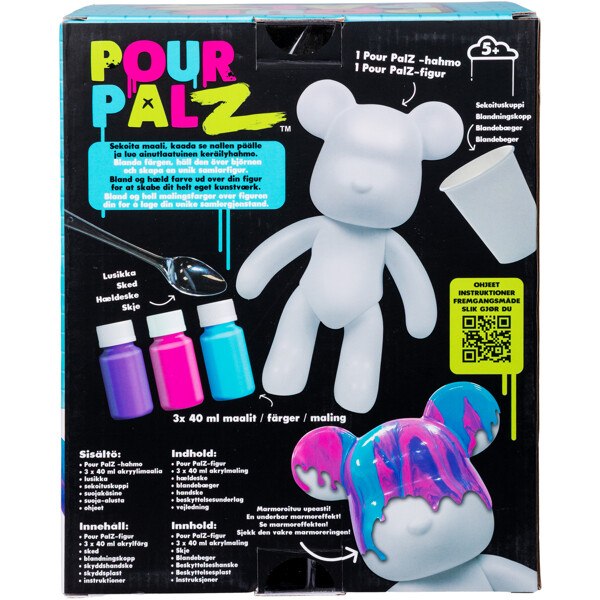 Der Pour Palz-Bär ist farblos. Mischen Sie die Farbe nach Belieben, gießen Sie sie über die Figur und lassen Sie sie trocknen. Sie erhalten eine ganz einzigartige Sammlerfigur, die keiner anderen gleicht!