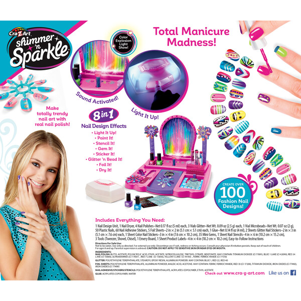 Gestalten Sie schöne und farbenfrohe Nägel mit dem Shimmer ‘n Sparkle 8 in 1 Lite-Up Designer Nail Studio. Schalten Sie das Licht ein und maniküren Sie Ihre Nägel! Nutzen Sie Ihre Fantasie mit vielen Edelsteinen, Folien, Glitzer und Aufklebern! Beenden Sie Ihre Nageldesigns mit dem mitgelieferten echten Nageltrockner!