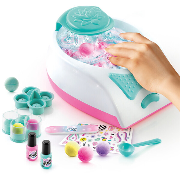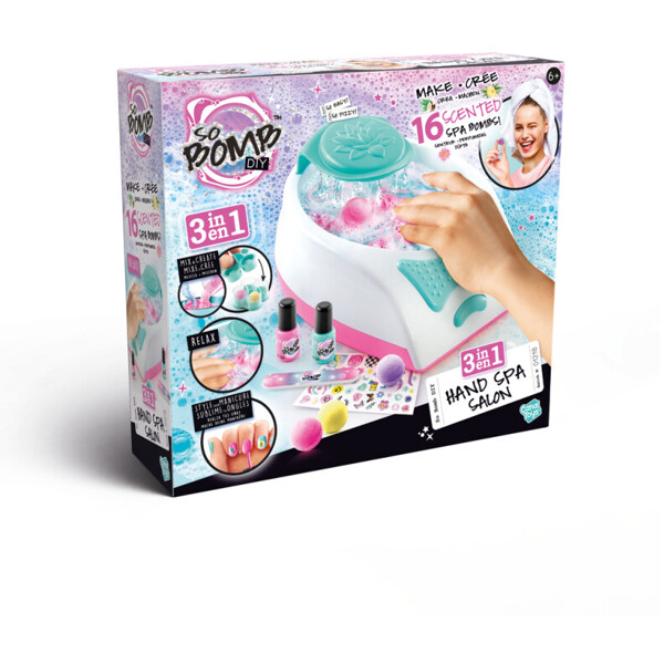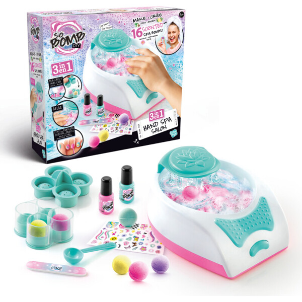 Der Salon enthält ein elektronisches Handspa-Gerät, alles, was Sie benötigen, um 10 beruhigende Badebomben mit entspannendem Duft herzustellen, plus ein Maniküreset, das Ihnen perfekte Nägel verleiht. Perfekt für lustige Spiele mit Freunden, Pyjamapartys oder Geburtstage.