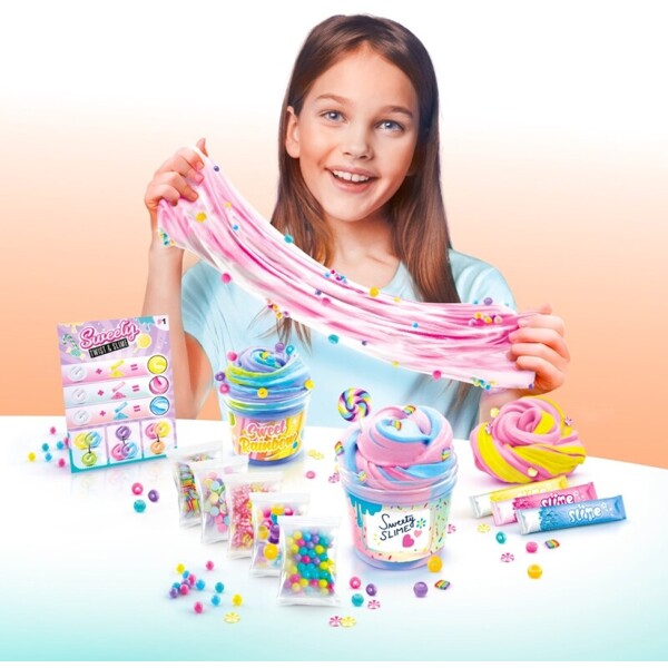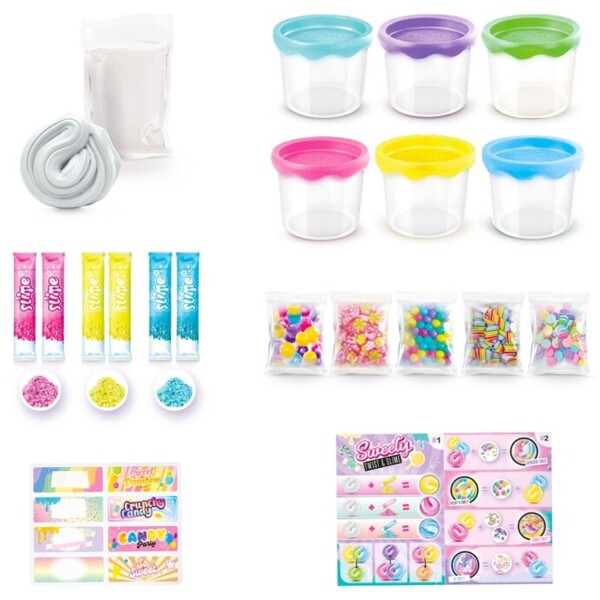 Enthält:- 1 Schleimbeutel- 10 Dosen- 1 Rezeptkarte- 8 Dekorationen- 8 Farbpulver- 3 Anhänger- 1 Aufkleber