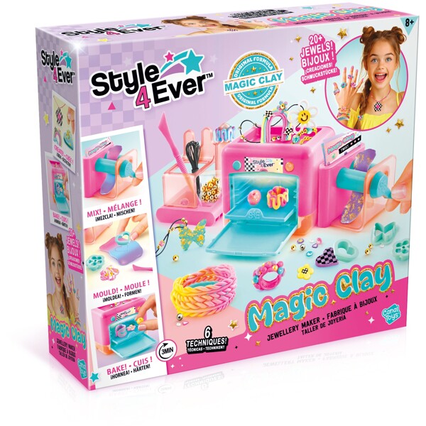 Enthält: - 1 3-in-1 Schmuckmaschine - 6 Beutel magischer Ton - 6 Formwerkzeuge - 2 Dosen Folie - 3 Beutel mit Dekorationen - 1 Bogen mit Aufklebern - 2 Beutel mit Perlen - 2 Fäden - 3 Anleitungsblätter - 1 Bedienungsanleitung.
