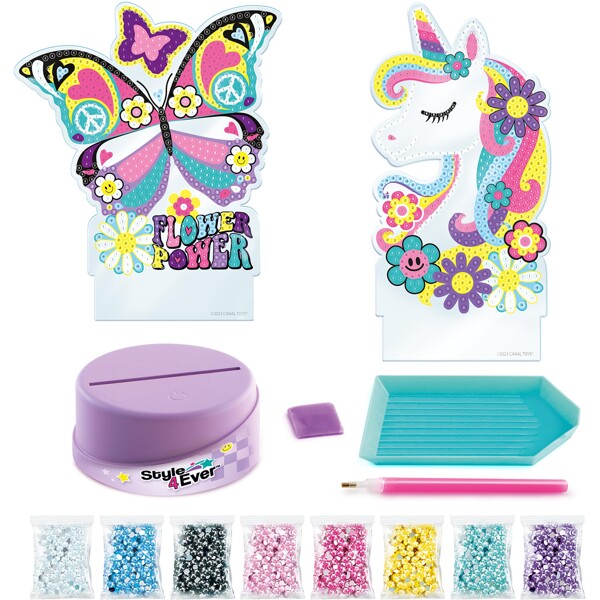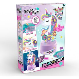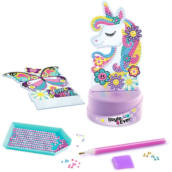 Enthält: - 1 LED-Fuß - 2 PVC-Designs, die du dekorieren kannst - 1 Schmucksteinapplikator - 1 Behälter für Schmucksteine - 1 Gummi - 7 Beutel mit Schmucksteinen.