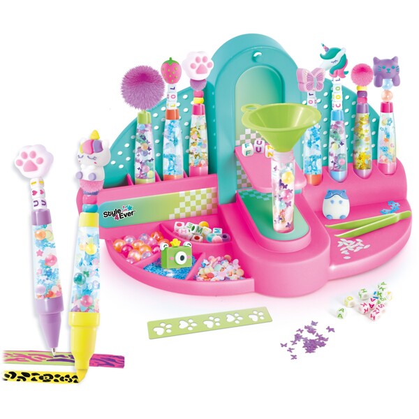 Erstellen Sie Ihre eigene Sammlung von DIY-Kugelschreibern und Textmarkern! Verwenden Sie die „Fabrik“, um Ihre Stifte zu füllen, fügen Sie Wasser und Dekorationen hinzu – und machen Sie sie völlig einzigartig, bis hin zum Radiergummi! Dekorieren Sie 8 Stifte und Textmarker mit vielen lustigen Accessoires, die im Set enthalten sind.Enthält:- 1 Studio- 6 DIY-Kugelschreiber- 6 abnehmbare Spitzen- 2 DIY-Textmarker- 1 Pinzette, 1 Trichter, 1 Löffel- 1 Stickerbogen- 2 Musterschablonen- 8 dekorative Radiergummis- 5 Beutel mit Dekorationen- 3 Beutel mit Perlen- 1 Beutel mit Pompons- 1 Gebrauchsanweisung