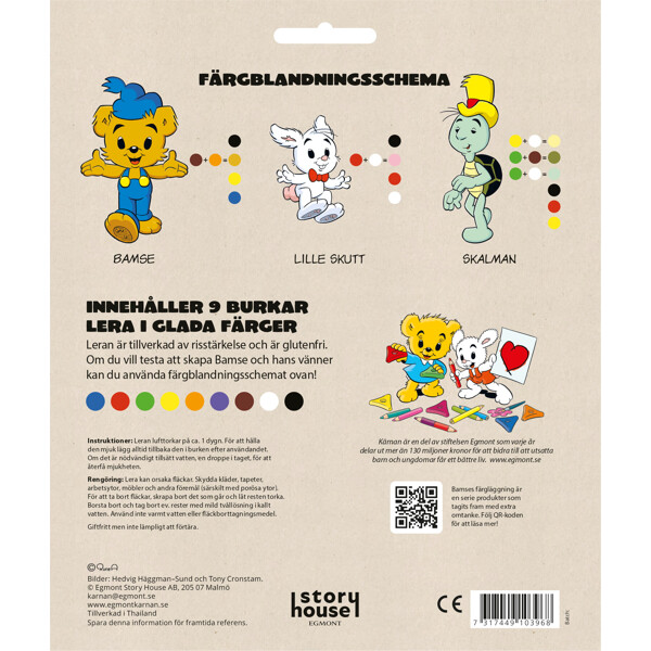 Die Knetmasse wird aus Reisstärke hergestellt und ist glutenfrei. Wenn du Bamse und seine Freunde gestalten möchtest, kannst du das Farbmischschema auf der Rückseite der Verpackung verwenden.