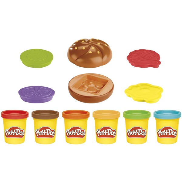 Kinder können fantasievolle Zutaten wie falsche Burgerpatties, Käse und Gemüse formen und sie dann auf die beiden Hamburgerbrötchen stapeln, um ihre kulinarische Kreation zu vollenden.