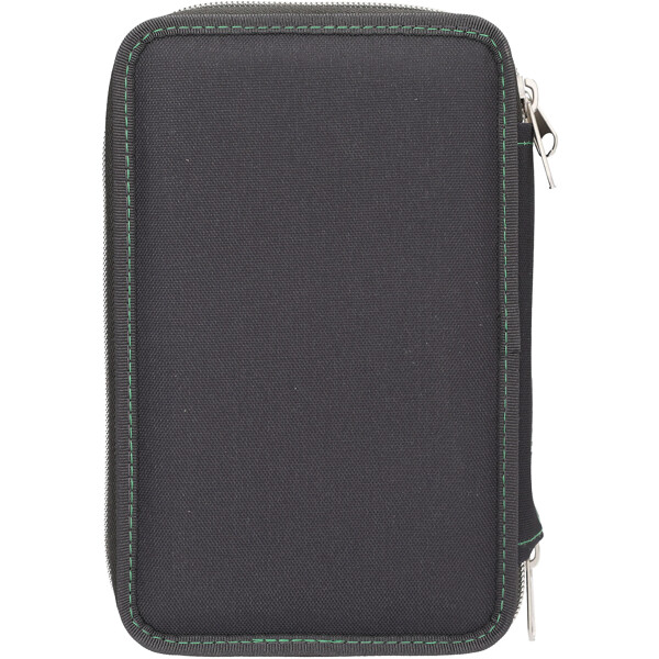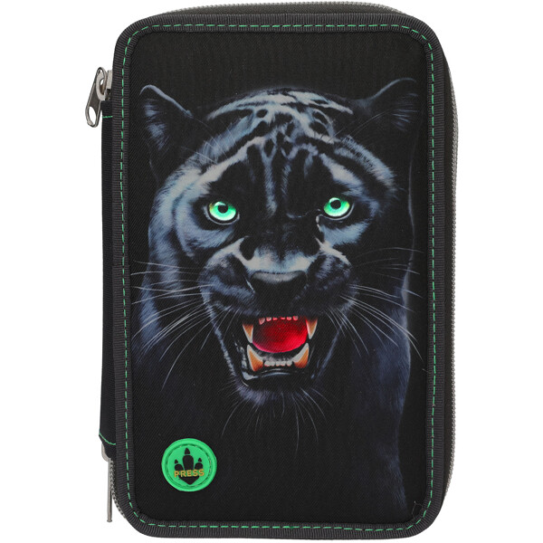 Cooles Federmäppchen aus der Adventure World PANTHER-Serie in Dunkelgrau mit grünen Details und einem großen Motiv eines schwarzen Panthers auf der Vorderseite, dessen Augen und Mund für ca. 15 Sekunden aufleuchten, wenn man den Knopf drückt.