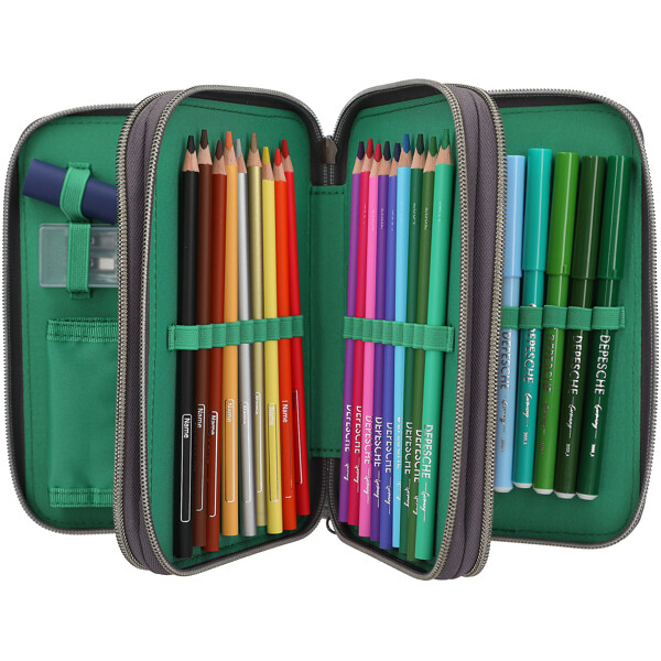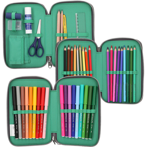Die drei separaten Fächer sind komplett gefüllt mit allem, was man zum Zeichnen, Schreiben und Basteln benötigt: jeweils 18 Farb- und Filzstifte, 2 Bleistifte, Anspitzer, Radiergummi, Lineal, Schere, Klebestift sowie eine kleine Klettverschlusstasche.