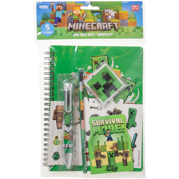 Minecraft Schreibset mit A5 Spiral-Notizbuch mit 60 liniertem Seiten (weiches Cover des A5 Notizbuchs 350gsm), mehrfarbiger Stift, Aufkleber, Bleistift, Radiergummi und kleinem Notizblock mit 40 Seiten.