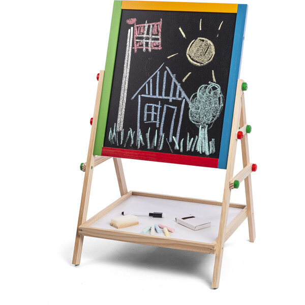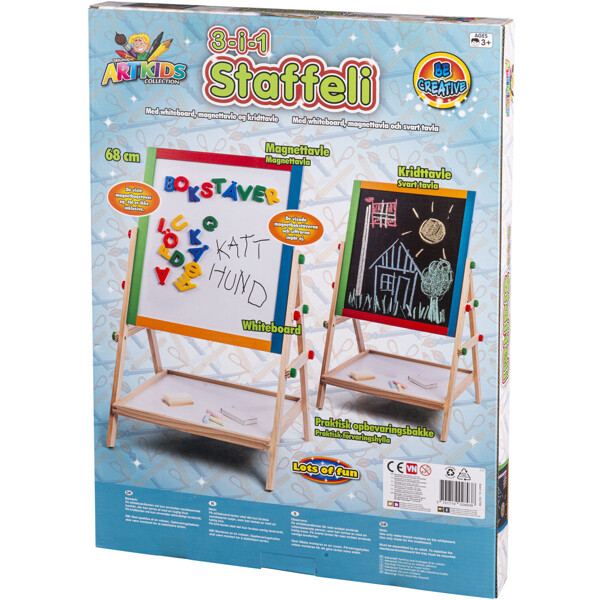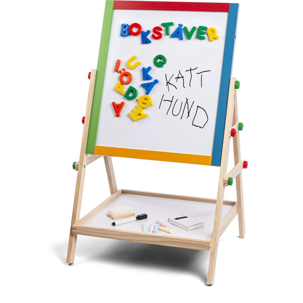 Ein smartes 3-in-1-Staffelei, das als Kreidetafel, Whiteboard und Magnettafel verwendet werden kann. Mit einem praktischen Ablagefach unter der Tafel.