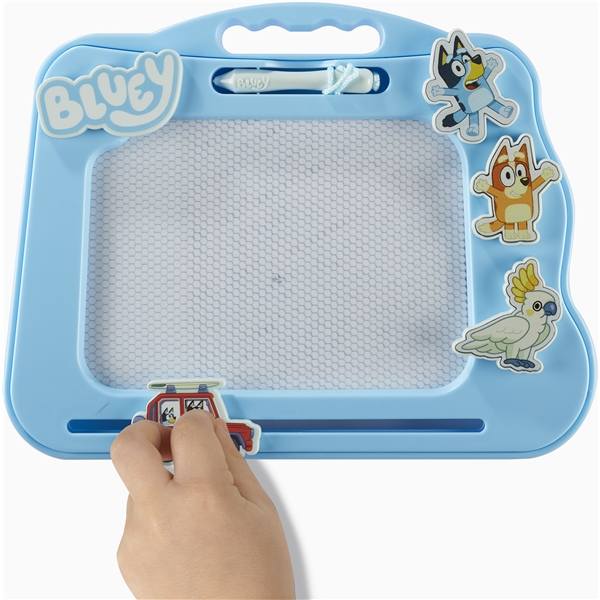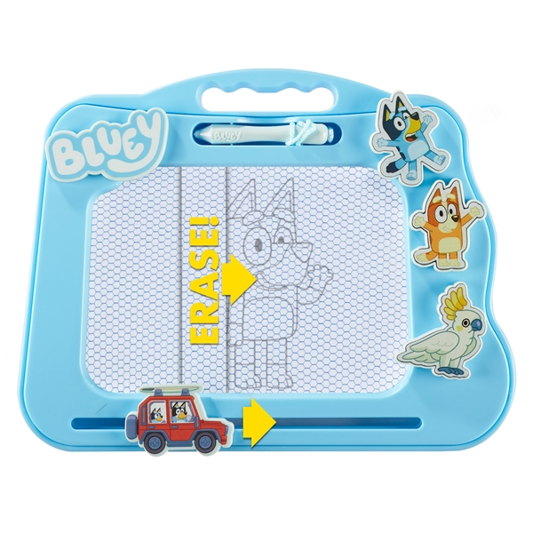 Eine lustige, magnetische Zeichentafel mit Bluey! Zeichne und lösche immer wieder ohne Schmiererei. Leicht zu tragen und mitzunehmen dank des praktischen Griffs. Neben dem magnetischen Stift sind drei süße Stempel für zusätzlichen Spaß enthalten. Einfach zu verwenden und zu löschen, indem man den Schieberegler in Form eines Autos hin und her zieht.