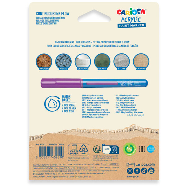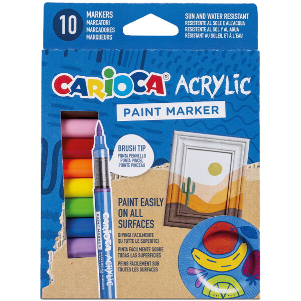 Box mit 10 Acrylfarbstiften. Künstlerische Pinselspitze, die nicht austrocknet und nicht aktiviert werden muss. Einfach zu verwenden und geeignet für verschiedene Oberflächen wie Holz, Glas, Metall, Stein, Keramik und Karton. Sonnen- und wasserresistent. Wasserbasierte Tinte mit hoher Deckkraft.