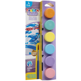 Ein Set mit 6 x 25 ml flüssiger Temperafarbe in schönen Pastelltönen und einem Pinsel von hoher Qualität.