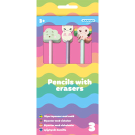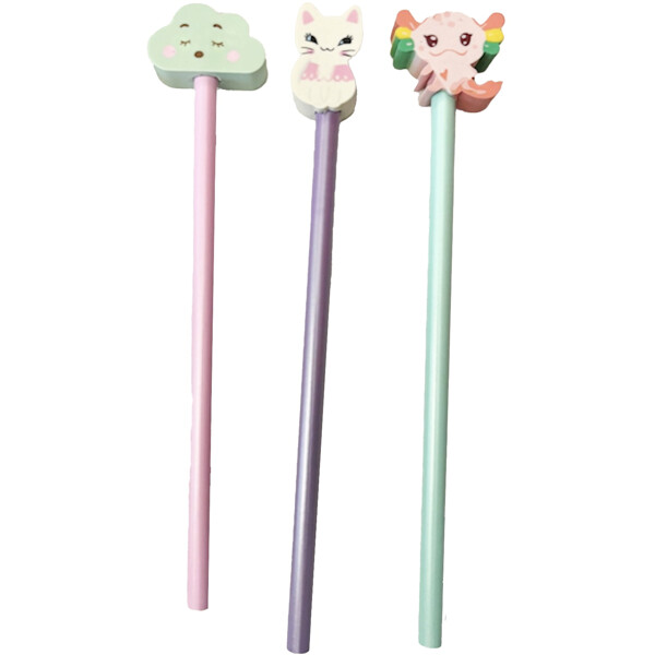Ein schönes Set mit drei Bleistiften mit niedlichen Radiergummis. Die Bleistifte kommen ungespitzt in herrlichen Pastellfarben und sind mit süßen Radiergummis in Form einer Wolke, einer Katze und eines Axolotls verziert.