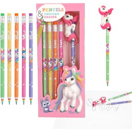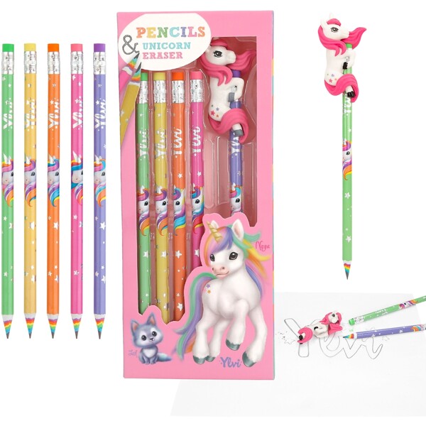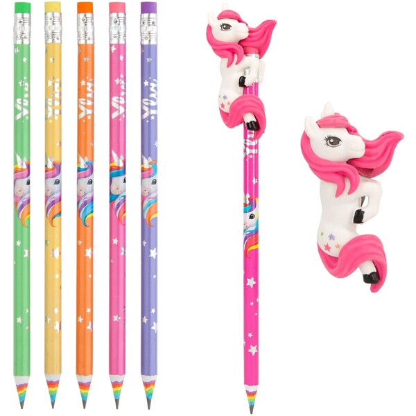 Fünfmal Schreibschrift à la Einhorn: Die schönen Bleistifte von Ylvi sind in den Farben Grün, Gelb, Orange, Rosa und Lila erhältlich. Jeder Stift hat einen Radiergummi in passender Farbe sowie ein regenbogenfarbenes Holz. Ein süßer Bonus ist der figürliche Radiergummi in Form eines Einhorns, der auch an den Stiften befestigt werden kann.