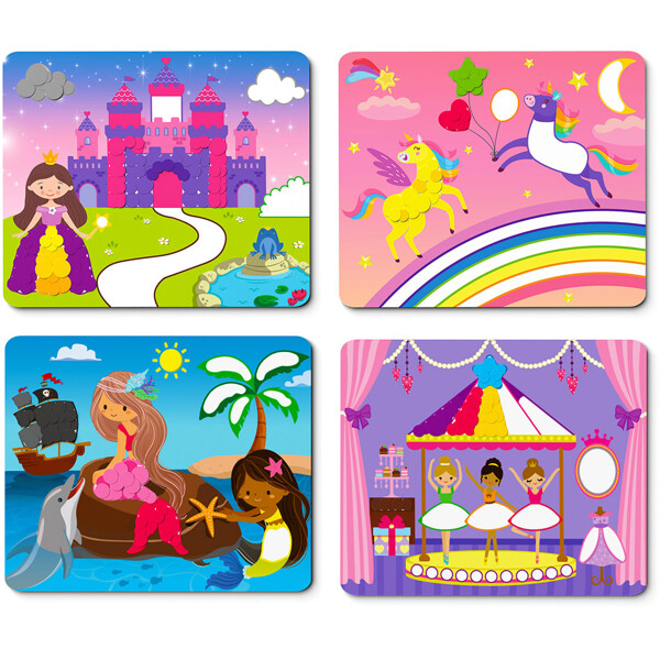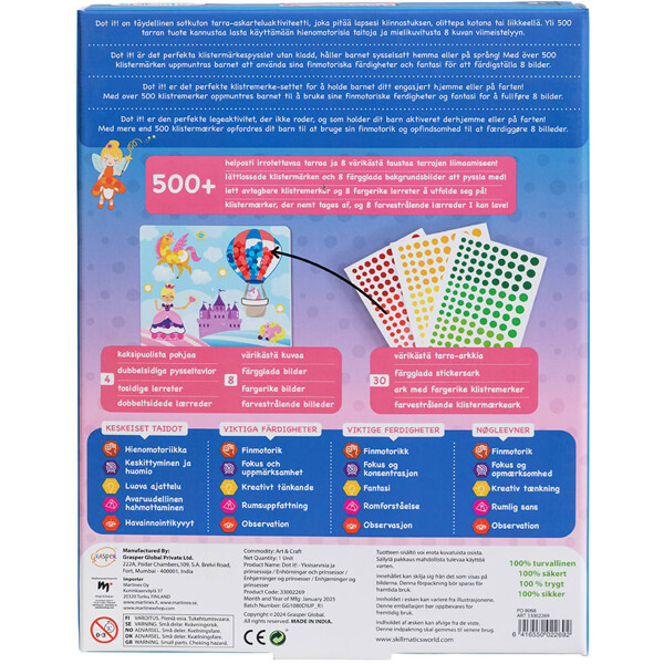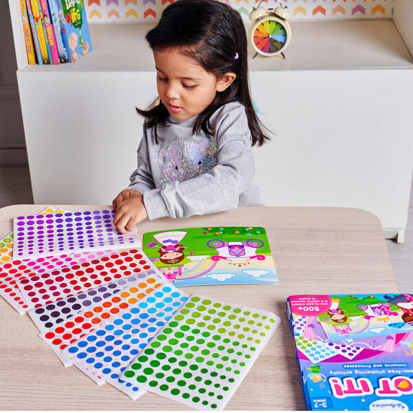 Mit über 500 runden Aufklebern in verschiedenen Größen und Farben kann das Kind seine Fantasie nutzen, um die mitgelieferten Bildkarten auszumalen. Das Thema sind magische Einhörner und Prinzessinnen. Es fördert die Feinmotorik, den Pinzettengriff, kreatives und räumliches Denken, die Auge-Hand-Koordination und die Konzentration.