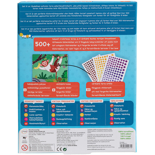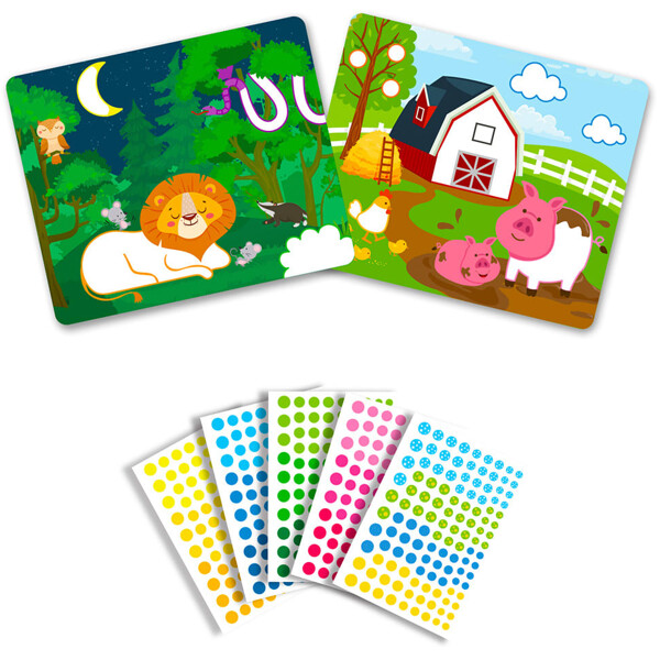 Mit über 500 runden Aufklebern in verschiedenen Größen und Farben kann das Kind seine Fantasie nutzen, um die mitgelieferten Bildkarten zu gestalten. Das Thema sind wilde Tiere, Bauernhoftiere und Meerestiere. Es fördert die Feinmotorik, den Pinzettengriff, kreatives und räumliches Denken, die Auge-Hand-Koordination und die Konzentration.