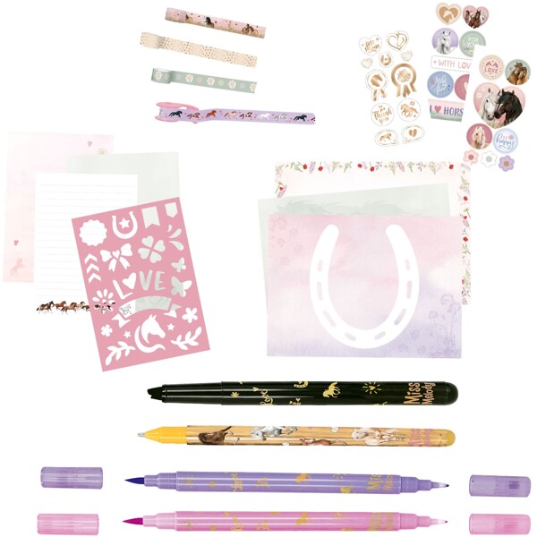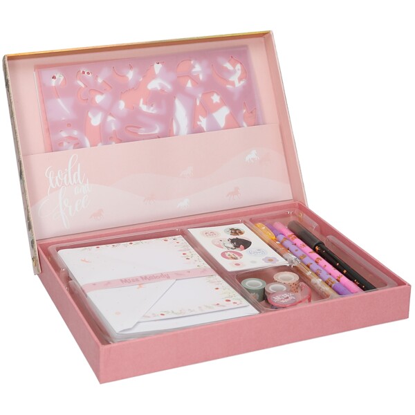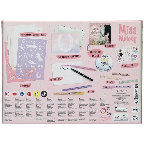 Handlettering ist im Trend! Diese kreative Box von TOPModel enthält alles, was Sie benötigen, um wunderschön gestaltete Briefe und Karten zu erstellen: 10 Blatt Briefpapier, 10 Umschläge, 5 Postkarten, 3 Stickerbögen, 1 Spender mit 4 schönen Klebebandrollen, 4 Stifte (1 Magic Handlettering-Stift, 2 Doppelfaserstifte in Rosé und Pink, 1 Gelstift in Gold) sowie 2 Schablonen. Inkl. einem Heft mit einfachen Designanleitungen und Ideen.