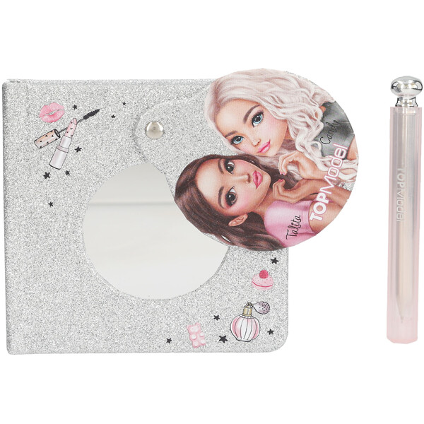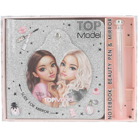Ein Schreibheft in einem silberfarbenen Glitzerumschlag mit süßen Beauty-Motiven und verstecktem Spiegel, schön linierte Seiten mit niedlichen Illustrationen sowie ein schicker silberfarbener Stift mit rosa Kappe.