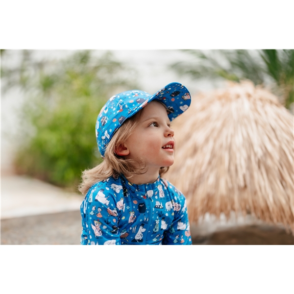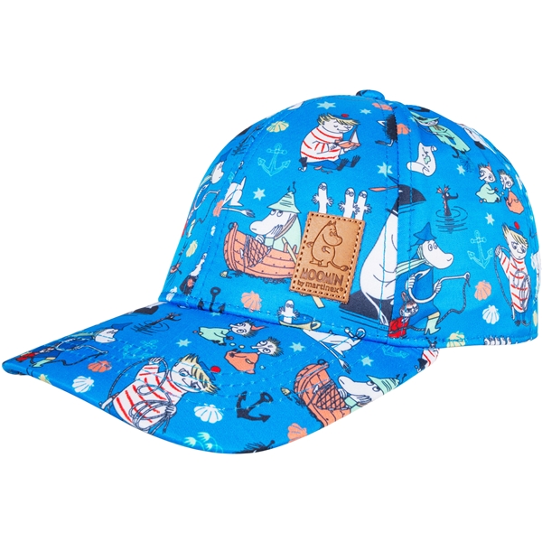 Eine klassische Kappe mit vorgebogenem Schirm, stabiler Vorderseite, gestickten Belüftungslöchern und einem verstellbaren Verschluss hinten. Die Kappe ist blau und hat ein lustiges Mumin-Muster.