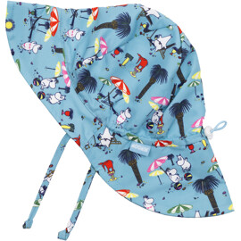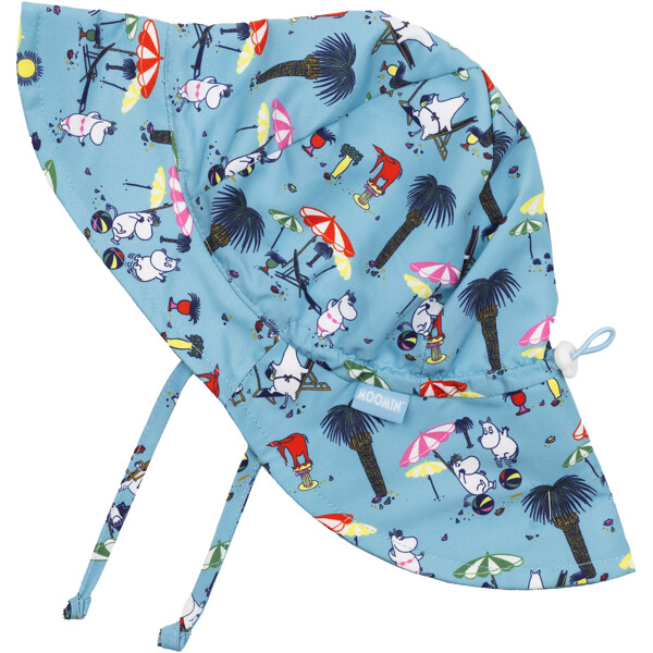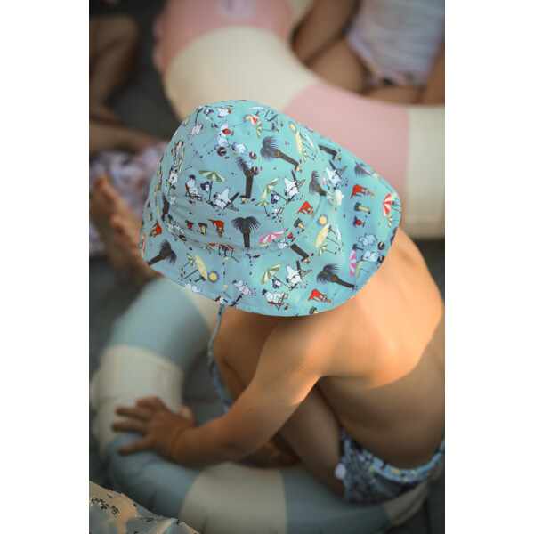 Der Mumin-Sonnenhut schützt Ihr Kind vor den Sonnenstrahlen. Er hat ein Band unter dem Kinn, um ihn sicher auf dem Kopf des Kindes zu halten, und einen Kordelzug hinten, mit dem die Größe angepasst werden kann.