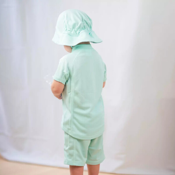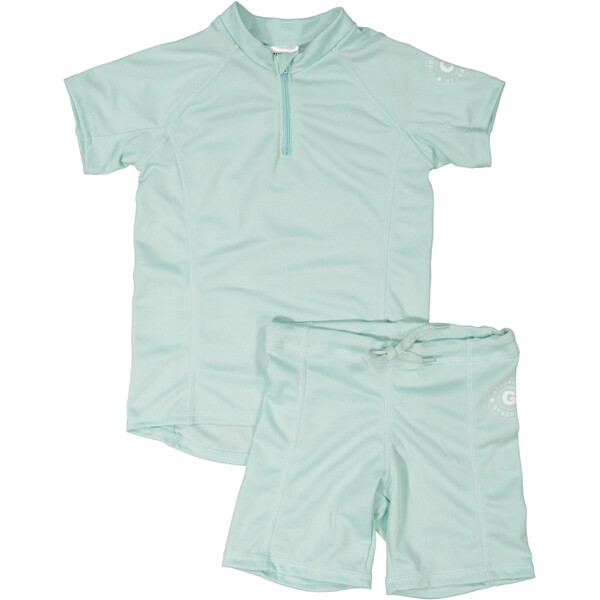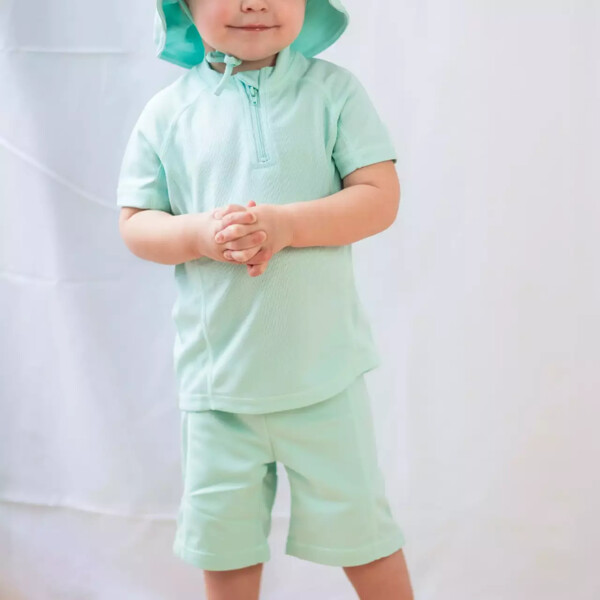Mintfarbenes UV-Badeset mit kurzärmeligem Shirt und Shorts. Es ist aus einem schnelltrocknenden Material gefertigt, mit UV-50+, das 98% der schädlichen UVA- und UVB-Strahlen der Sonne blockiert. Ein großer Favorit bei Familien mit Kindern. Mit einem UV-Set schützt du dein Kind vor den starken Sonnenstrahlen sowohl am Pool als auch am Strand. Das Shirt hat einen hohen Halsausschnitt und einen Reißverschluss vorne für einfaches An- und Ausziehen.