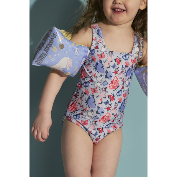 Ein schöner Mumin-Badeanzug für Kinder. Der Badeanzug ist vorne gefüttert, hoch am Rücken mit breiten und stabilen Trägern. Hergestellt aus einer elastischen, schnell trocknenden Polyester-Mischung.