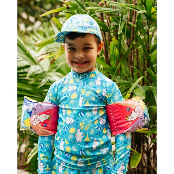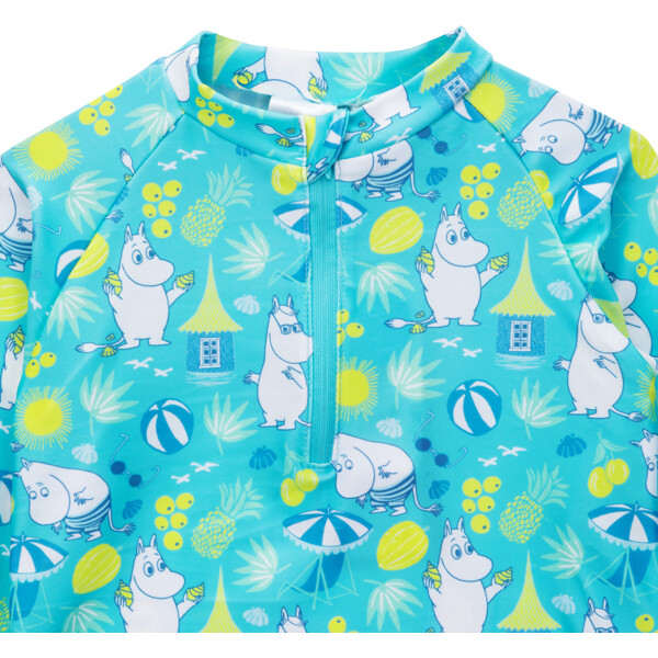 Ein praktisches Mumin-Badehemd für Kinder. Das Badehemd hat lange Ärmel und einen Reißverschluss oben. Hergestellt aus einer elastischen, schnell trocknenden Polyester-Mischung.