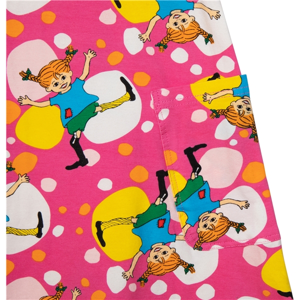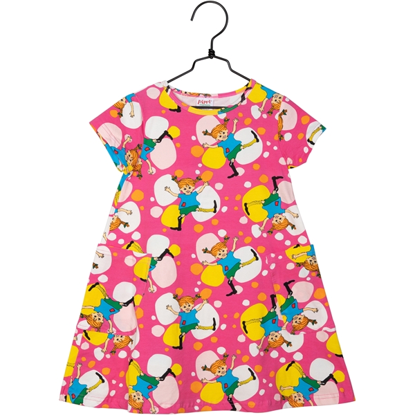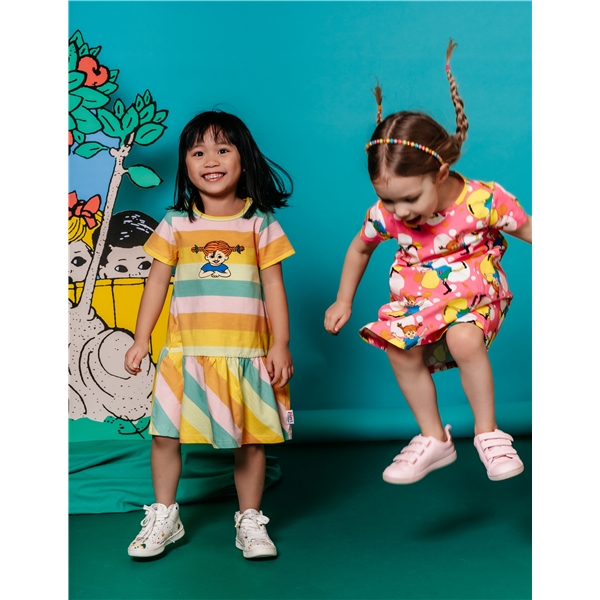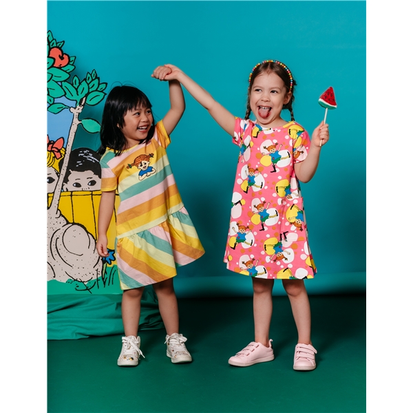 Ein farbenfrohes Pippi Sommerkleid für Kinder. Das A-Linien-Kleid hat kurze Ärmel und zwei aufgesetzte Taschen am Saum. Das Kleid ist aus einer GOTS-zertifizierten Bio-Baumwollmischung gefertigt.