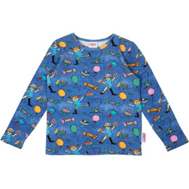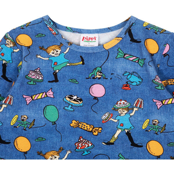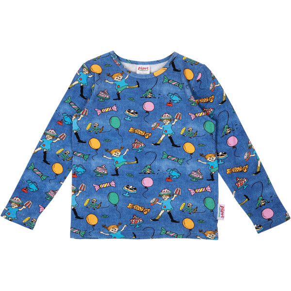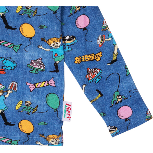 Ein weiches und bequemes Pippi Langstrumpf-Shirt für Kinder, in geradem Schnitt mit langen Ärmeln und rundem Halsausschnitt. Das Shirt ist herrlich denimblau mit einem festlichen Muster. Das Produkt enthält zertifizierte Bio-Baumwolle.