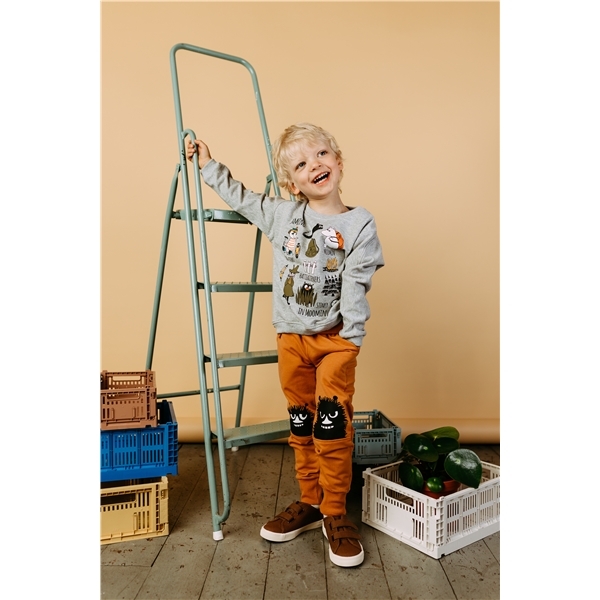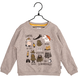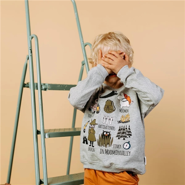 Mumin Collegepullover Grau ist ein weicher und bequemer Mumin-Pullover in Oversize. Der Pullover hat einen Rundhalsausschnitt und ein gedrucktes Muster mit verschiedenen Mumin-Charakteren in einem Camping-Thema.