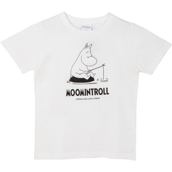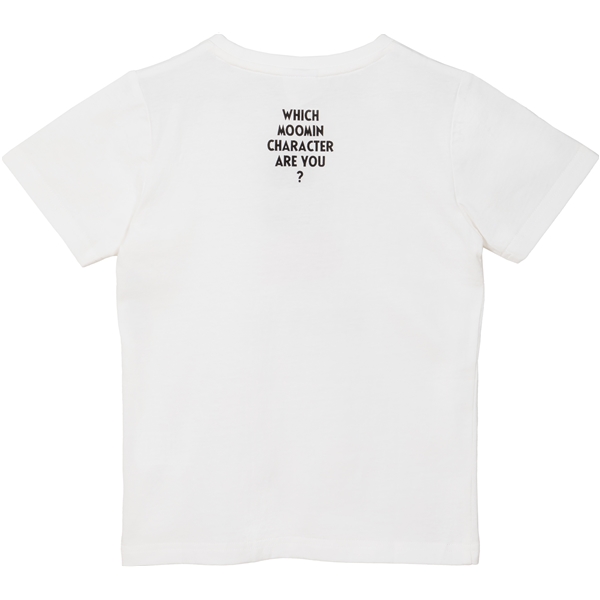 Ein schönes Mumin-T-Shirt für Kinder. Das T-Shirt ist cremeweiß, in geradem Schnitt mit kurzen Ärmeln und rundem Halsausschnitt. Im Nacken steht die Frage 'Which Moomin character are you?' und vorne ist der englische Name der Lieblingsfigur zusammen mit einem Bild davon abgebildet. Hergestellt aus 100% Baumwolle. Öko-Tex.