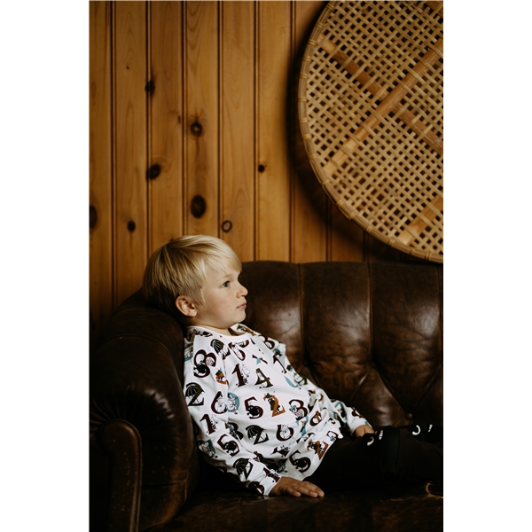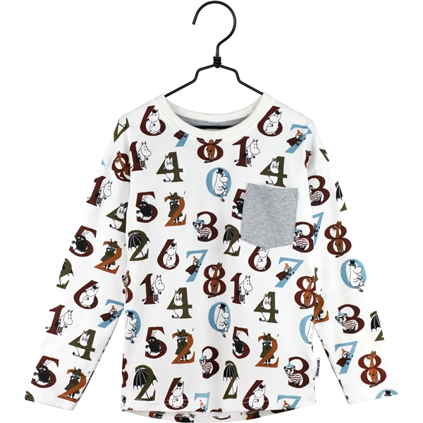 Mumin Nummer Pullover Kitt ist ein herrlicher, langärmeliger Pullover mit einem verspielten Muster aus Zahlen und Mumin-Charakteren. Der Pullover hat eine graue Brusttasche als cooles Detail.