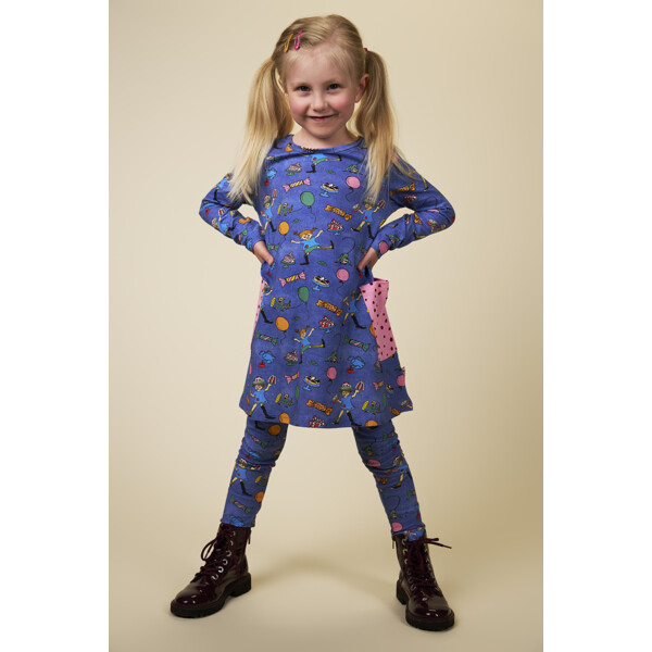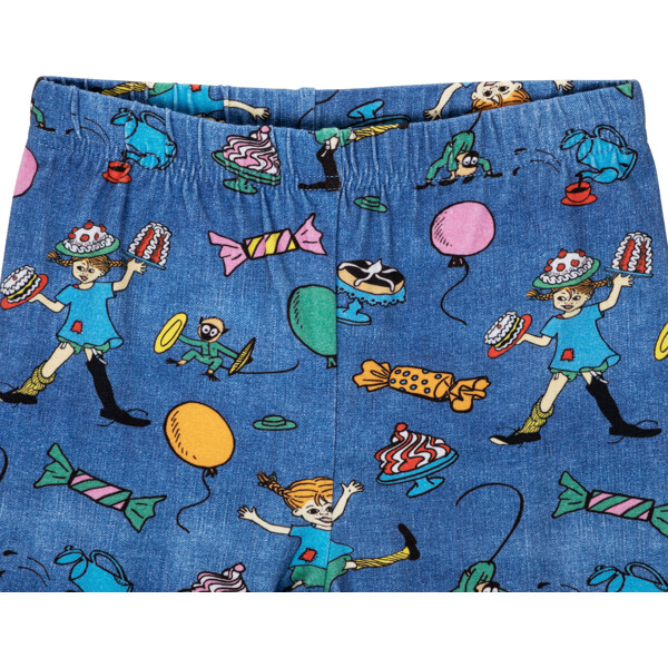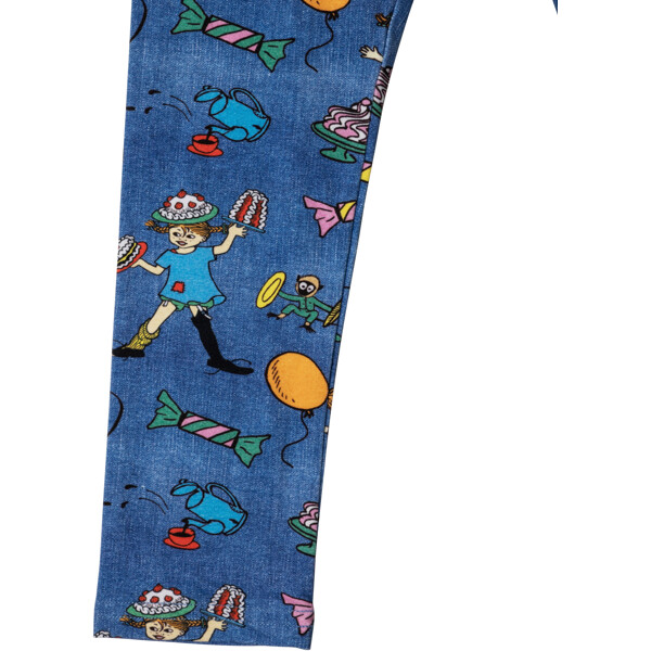 Weiche und bequeme Pippi Langstrumpf-Leggings für Kinder, mit eingearbeitetem Gummizug in der Taille. Die Leggings sind herrlich denimblau mit einem festlichen Muster. Das Produkt enthält zertifizierte Bio-Baumwolle.