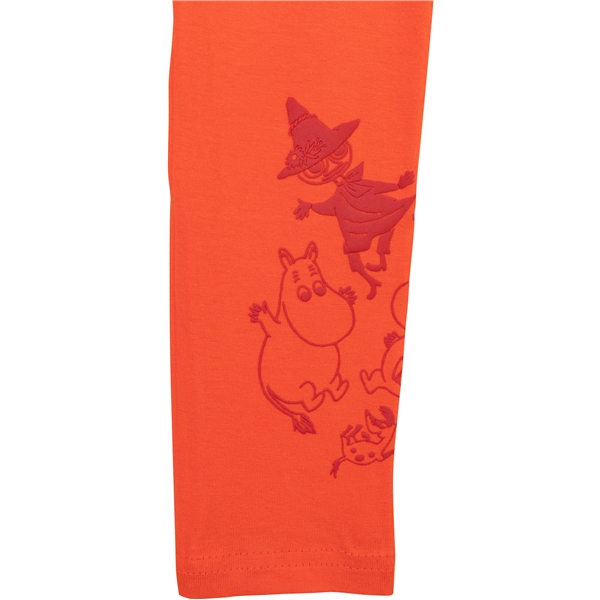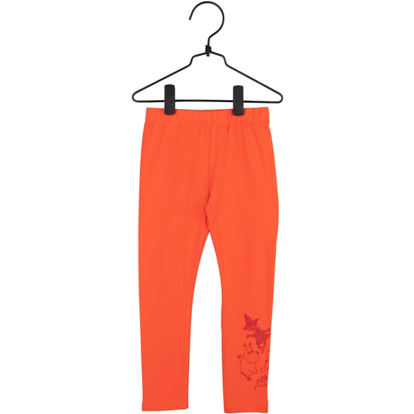 Schöne, knallrote Leggings mit eingearbeitetem Gummizug in der Taille. Unten am linken Bein befindet sich ein leicht erhabener Gummidruck von Mumintroll, Snorkfräulein, Klein-My und Schnupferich in dunklerem Rot.